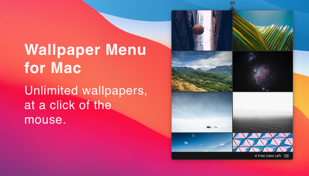 Wallpaper Menu works simply. It lives on the menu bar on your Mac and every time you click it, it shows you a fresh set of wallpapers. Simply click one and it is set as your desktop wallpaper. Doesn't get any easier!